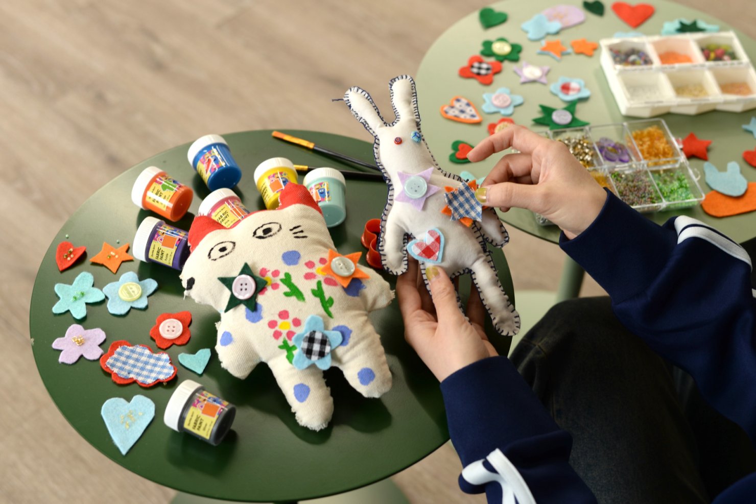 このぬいぐるみをベースに、お好きにペイントしたり、フェルトやビーズで自由にカスタムした世界に一つだけのぬいぐるみを作りいただけます!