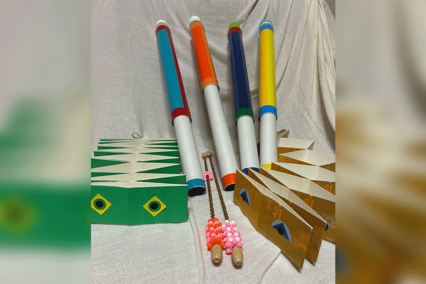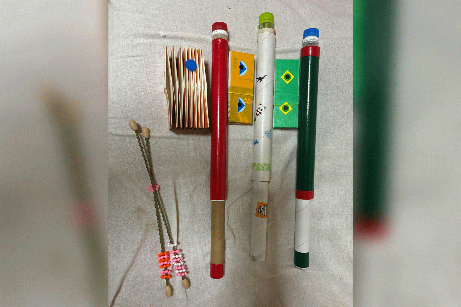 音の出るラップ芯のキュッキュッ棒、牛乳パックのヘビヘビさん、長〜いクルクルおはじきなどなど。